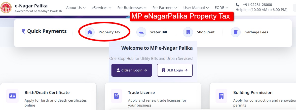 The official portal for paying property tax in Madhya Pradesh is
